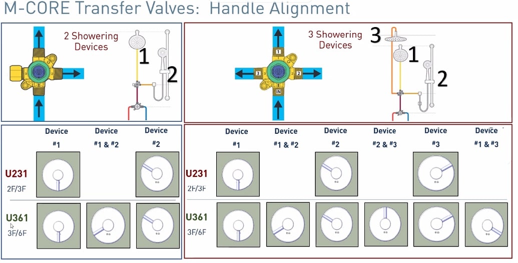 The U231 Transfer Valve has an independent function. That means you’ll only have the option to run only 1 showering device at a time. For the shared functionality, where you can run multiple showering devices at the same time, you would need the U361 Transfer Valve.