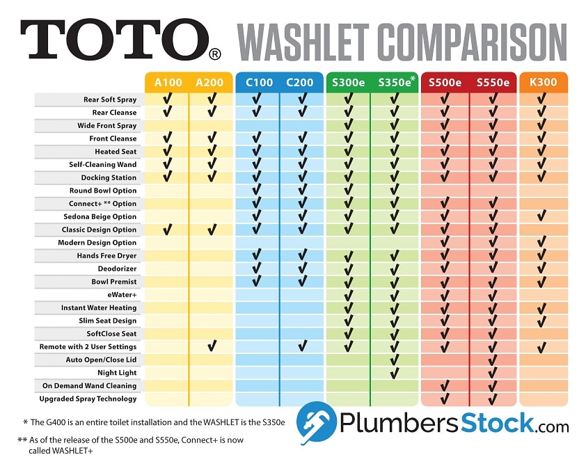 所有这些选择都适用于细长的厕所装置。自从S300e和S350e发布已经有几年了,所以我们非常兴奋能有一个新的加入这个系列。与以往的更新不同,S500e和S550e实际上是在取代它们的前辈。很快,您将无法购买S300e和S350e(但C100, C200, A100和A200仍将可用)。如果你以前没有使用过WASHLET,你应该知道它们是易于安装并提供简单的方便的用户体验.